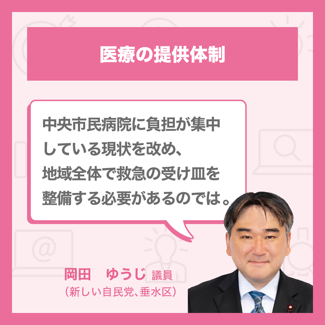 市民の中に「何かあれば、まずは中央市民病院に」との傾向があることは否めない。救急医療体制における一次、二次、三次の役割分担を適正に果たせるよう、民間病院の協力も得ながら、市民の意識改革といった視点も含め取り組んでいきたい。